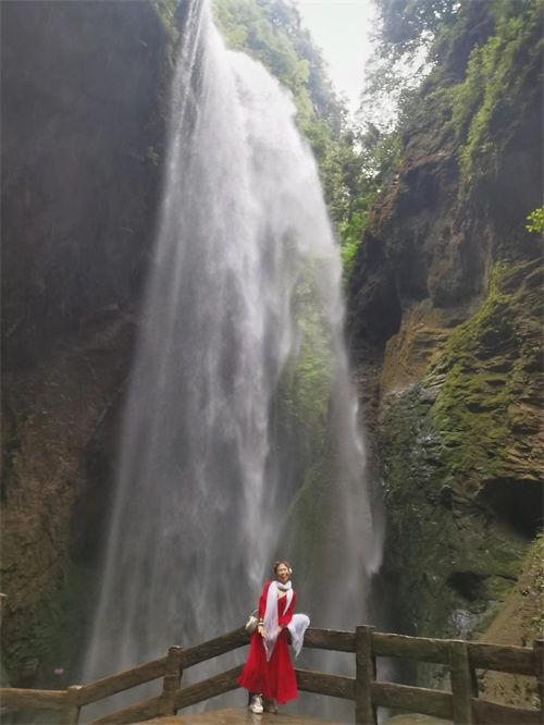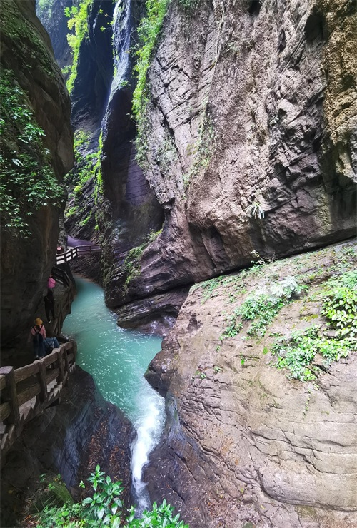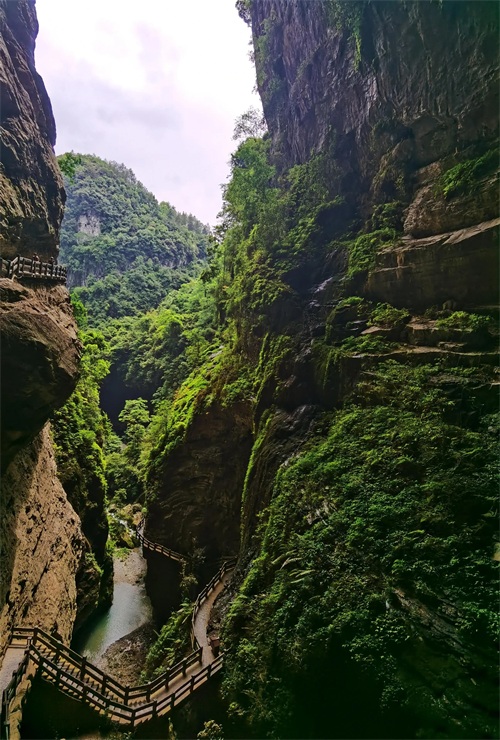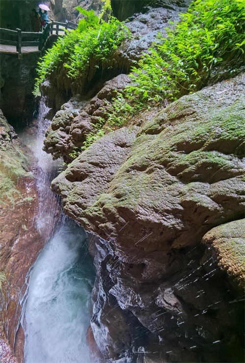 2.龙水峡地缝由千万年前造山运动而形成,壁陡峡深,在这里开始一场惊险刺激的“地心探险”。处处是瀑布、溪流和原始植被,头顶不断有岩积水滴下。栈道全长约4公里,游览依然基本都是下坡,不走回头路,道路很窄,地面湿滑。全程差不多用一个半小时,走出来就可以乘坐摆渡车到仙女山游客中心。
