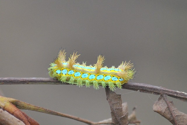 褐边绿刺蛾产的卵为淡黄绿色的椭圆形,发展成活辣子有3厘米左右长,宽度不足1厘米,头比较小,身上有八个触角一样的毛刺。它的毛有毒,别蜇伤疼痛感强烈,过后又痛又痒,而且会持续好几天。