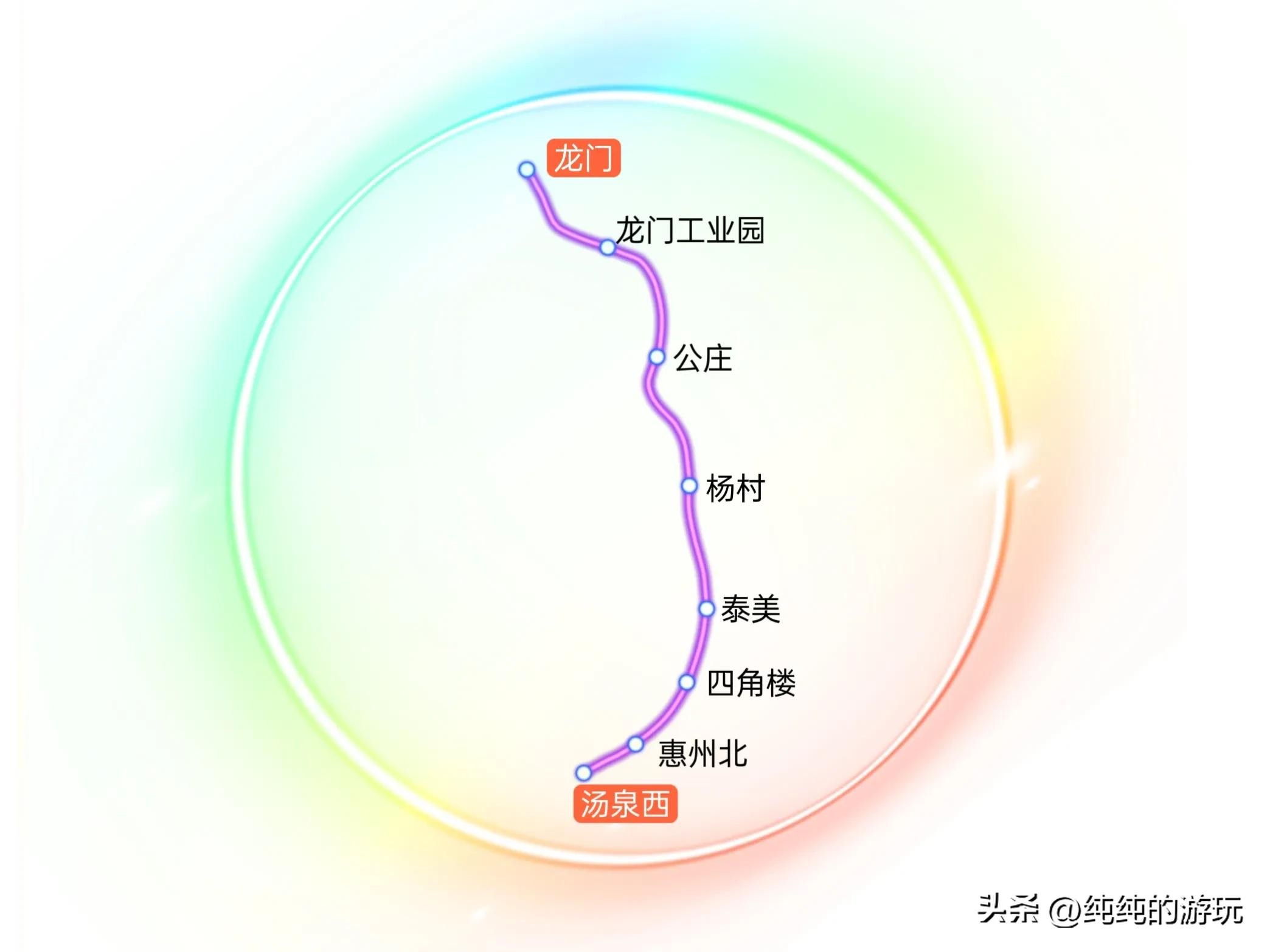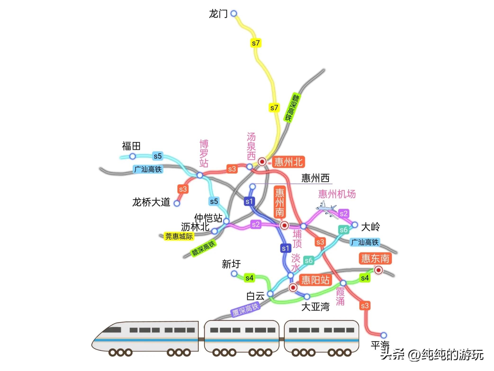 s7:全长约78.6公里,计划起于博罗县 ,从s3线的汤泉西站引出,途经惠城区惠州北站、博罗县四角楼、泰美镇、杨村镇、公庄镇后,进入龙门县,途经龙门工业园后,直至龙门县城为止。这也是规划中七条市域铁路唯一北上的线路。
