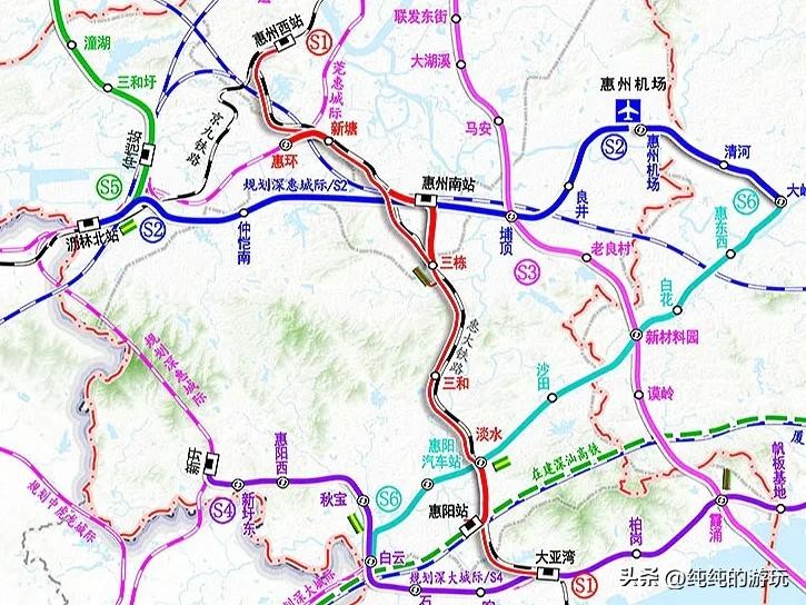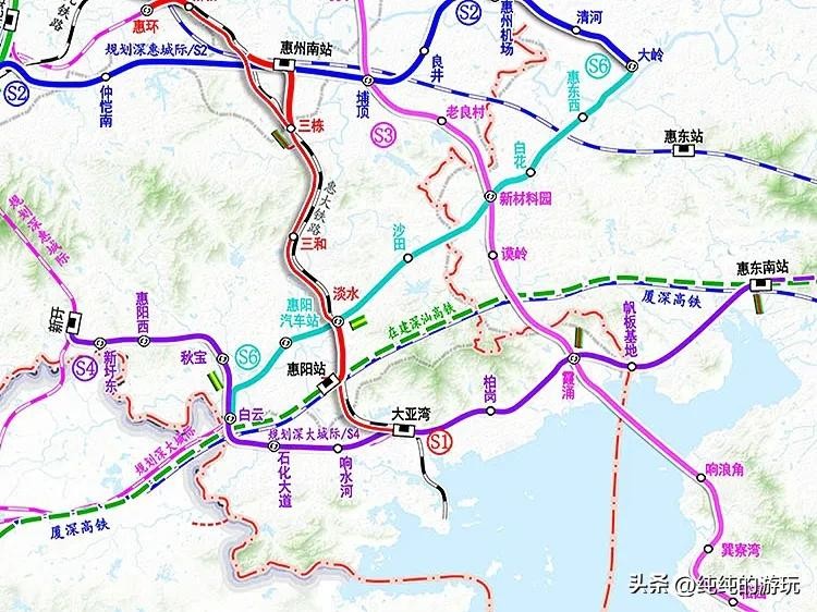 s4:线路全长约62.6公里,串联惠阳区、大亚湾和惠东县,计划从惠阳区规划中的深惠城际线新圩站引出,依次设立新圩东站、惠阳西站、秋宝站、白云站、石化大道站、响水河站后,接入大亚湾站,再途经柏岗、霞涌、帆板基地后,直至接入厦深高铁和汕汕高铁的惠东南站为止。