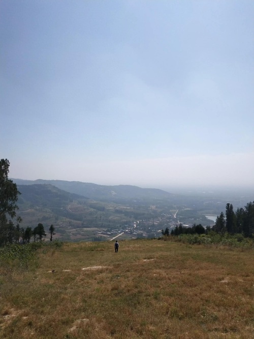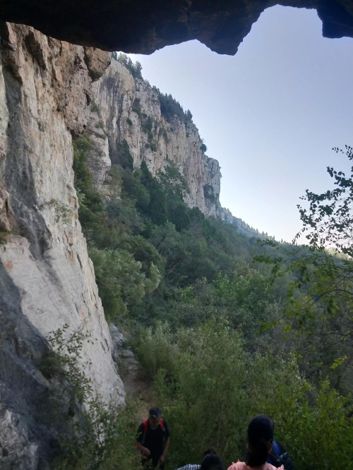 这段行程的路程很长,山路上都是石头,夹杂密密麻麻的野韭菜花,路两旁密布松林,空气中都有松树的香气。走了大约10km路吧,参观了滑翔基地,吃了野核桃。就开始下山,下山的路特别难走。几乎是直上直下的。其实也没有路,是带队的田老师在前面儿用双脚、双手为大家开辟出来的一条路。什么是驴友?也就是走一条只有一条驴通过的路吧。山谷里还长着红彤彤的柿子树,看着就好吃,但是太高了,实在是望尘莫及。
