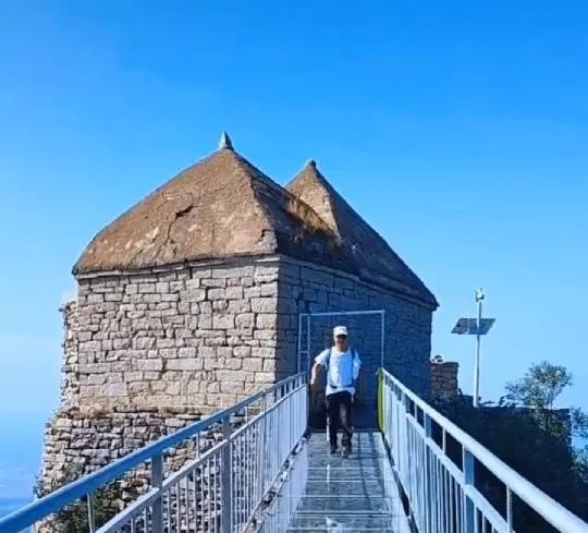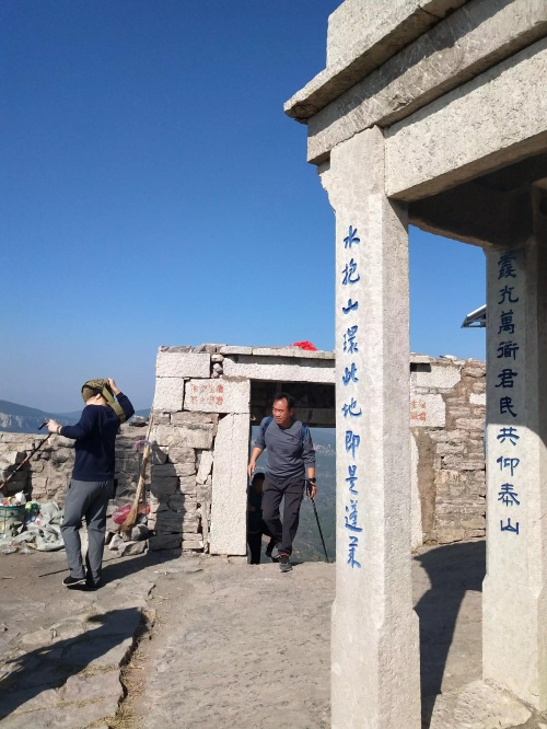 上午10点左右,我们登上了小泰山的山顶,山顶有碧霞宫,供奉着泰山老奶奶,建在悬崖之上,至山门58级台阶,象征泰山的18盘,石条砌成,门额刻“碧霞宫”3字。石块砌体,坐北朝南,刻有四副对联,碧霞宫的周围建造如东岳,故名小泰山。
