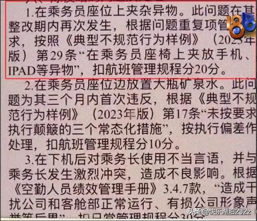 可让她怎么都想不通、特别生气的是,东航对她的处罚太重了,直接扣了她30分,这就意味着她丢了工作。可那个乘务长呢,只被扣了25分,工作还稳稳当当的。空姐在视频里头一直强调,说公司这么处理太不公平了!