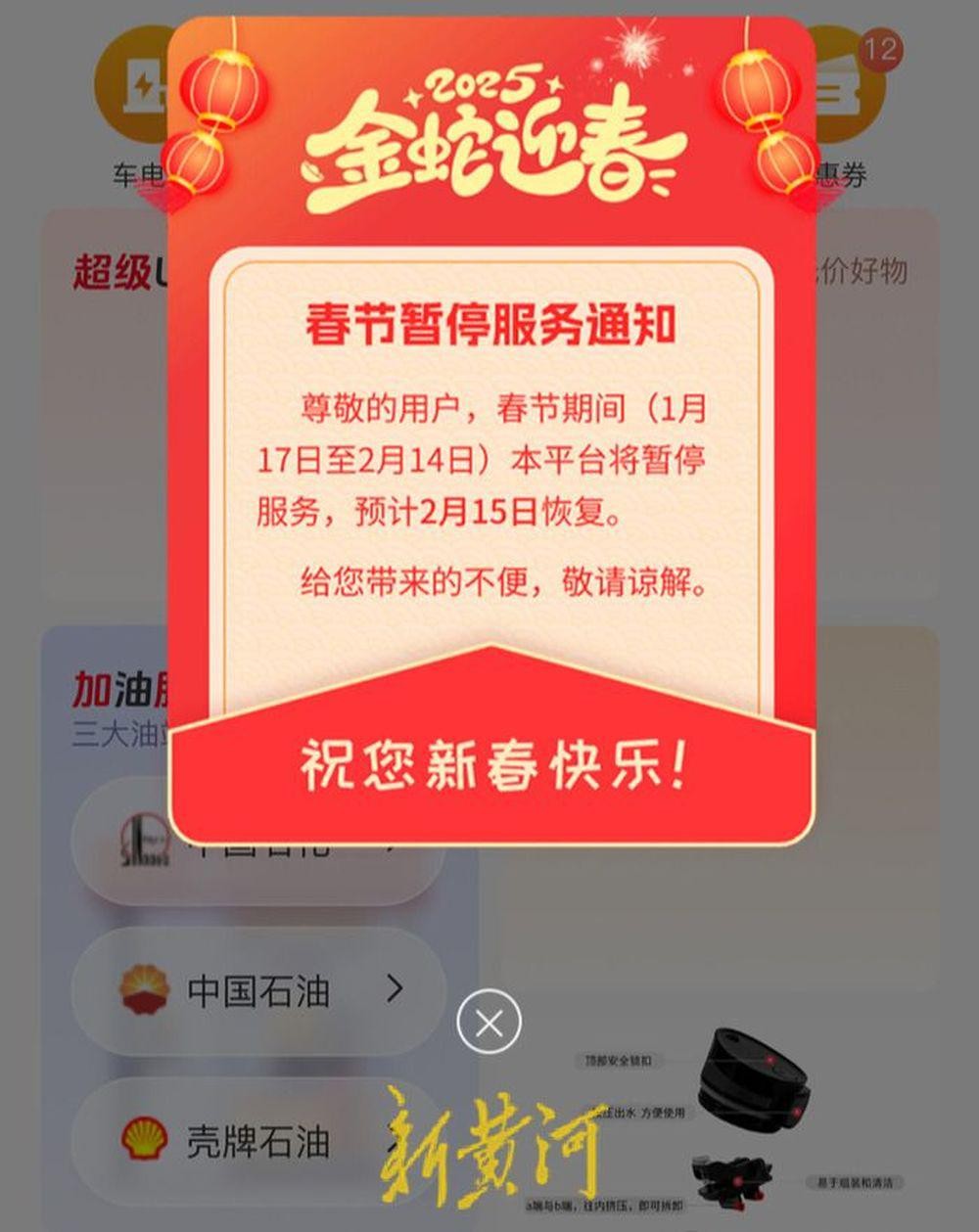 记者登录车油喜(现更名为鲁小礼)微信小程序时,跳出一则“春节暂停服务通知”:尊敬的用户,春节期间(1月17日至2月14日)本平台将暂停服务,预计2月15日恢复。在小程序首页,山东一卡通的充值入口较为显眼,点击进入页面后,显示一卡通加油,跳出扫码充值的按键。而壳牌油站上线的宣传页面仍在首页轮番推荐,加油服务区的推荐语为“三大油站任你选”,但点击进入后,显示“敬请期待”。