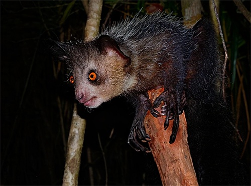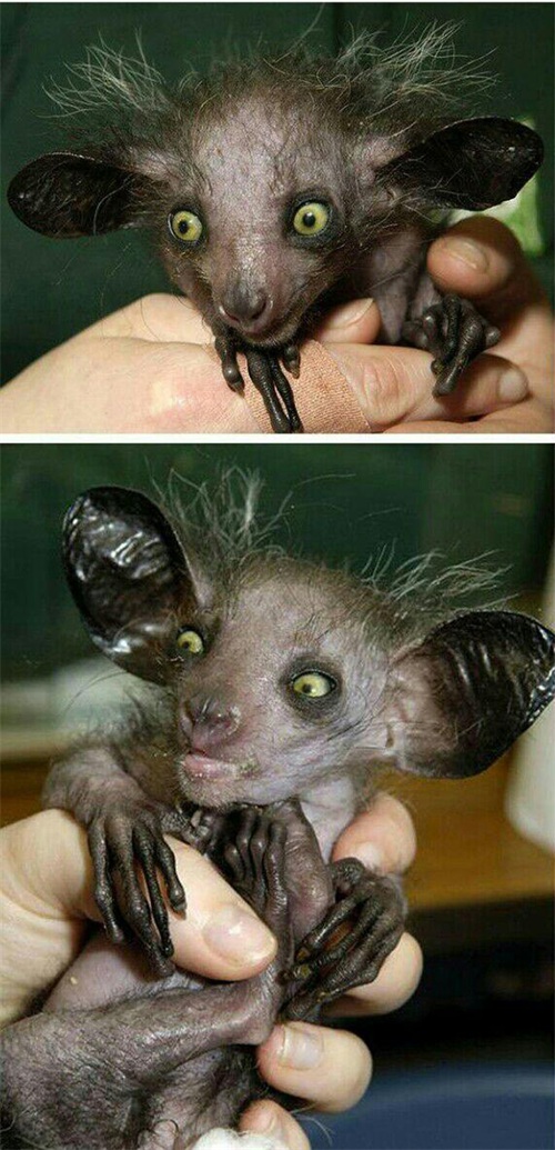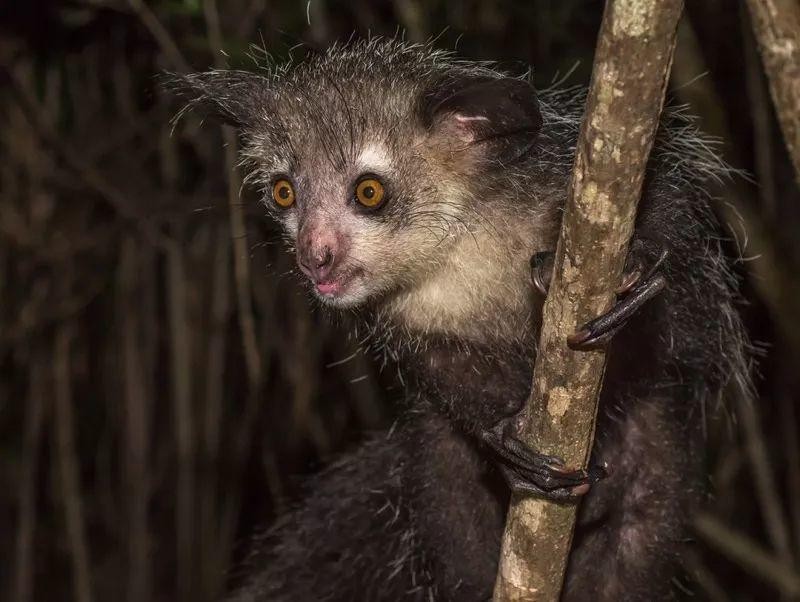 马达加斯加指猴外貌十分特殊,可以说是奇丑无比,单从外表上来看指猴非常像一只大老鼠。