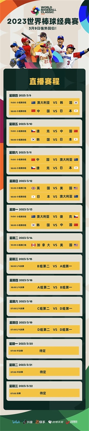 为了给棒球迷们带来丰富便捷的观赛体验,哔哩哔哩、抖音、快手、微博、五星体育各大平台将对赛事进行同步直播,为观众实时同步现场一手赛况。观众可以为支持的队伍“云”加油,“零距离”感受棒球魅力。同时,合作平台还会提供全方位的WBC赛事资讯和精彩集锦,伴随精彩专业的棒球比赛解说,共同为中国棒球迷带来全面、方便、易懂的线上观赛体验。
