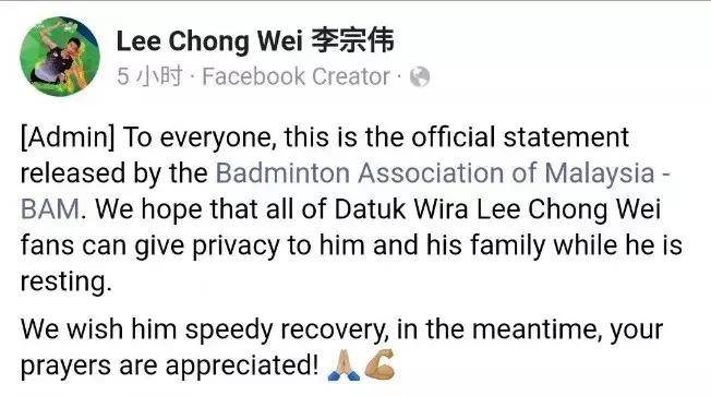 脸书称,希望大众可以给李宗伟更多的私人空间,并且送出了祝福,希望他可以早日康复。还表示对大家关心的感谢。