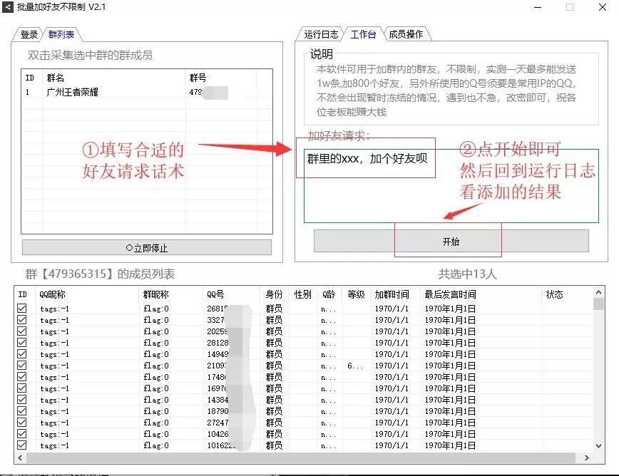 最后就很简单了,点击开始就行了。添加的进度和运行日志,可以点运行日志去查看。软件的说明是添加群内的群友,一天最多能发送1万条好友请求信息,能加800个好友。