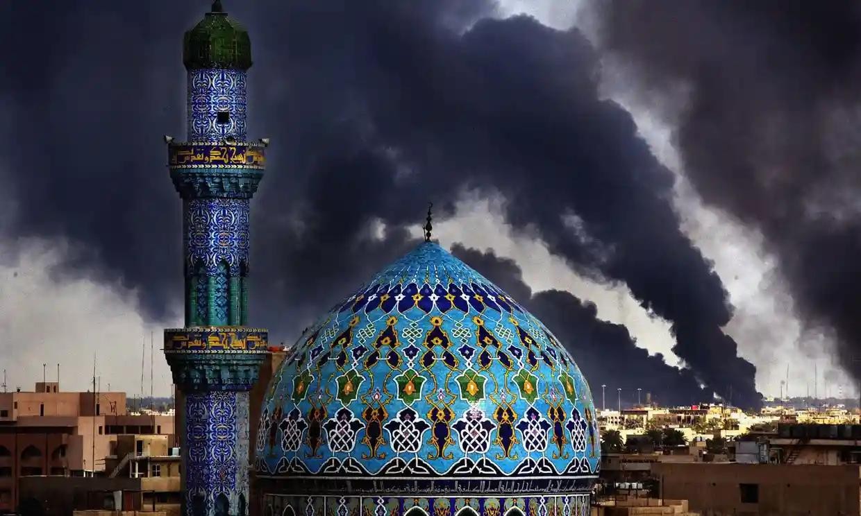 2003 年 3 月 22 日,巴格达的沙希德清真寺,后面是空袭产生的熊熊烈火。(图片来源:Getty)