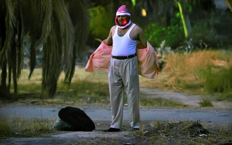 2007 年 12 月 24 日,在 Baiji 炼油厂附近的一次行动中,美国士兵将激光瞄准器对准了一名男子,命令他解开衬衫。(图片来源:路透社)