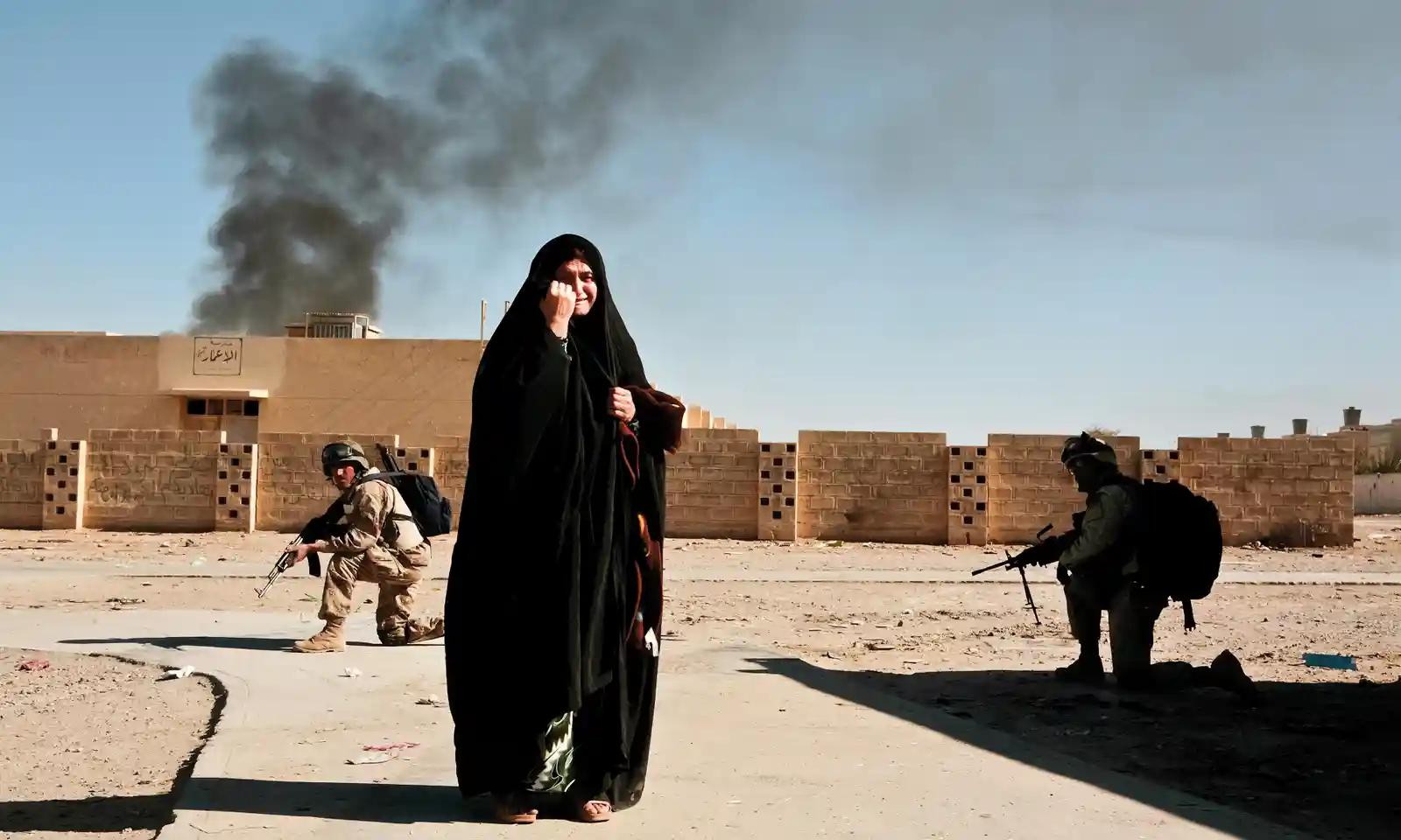 2014年-2015年,美军在伊拉克发动“钢幕行动”,打击叛乱分子,一名伊拉克妇女从旁经过。(图片来源:卫报)