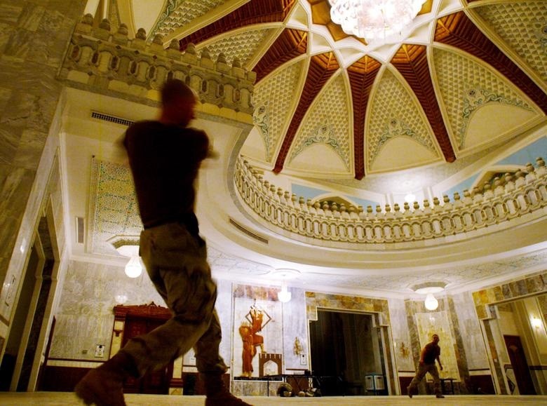 2003 年 9 月 16 日,美国陆军士兵在萨达姆的某一个宫殿内打棒球。(图片来源:路透社)