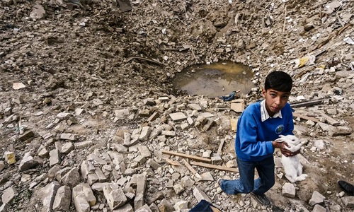 在美国轰炸巴格达一个平民区后,一名儿童捡回了一只兔子,具体时间不详。(图片来源:卫报)