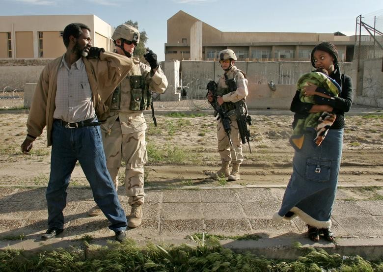 2005 年 3 月 15 日,巴格达一个交通检查站,一名男子接受美军检查,他的妻子和孩子就在旁边站着。(图片来源:路透社)