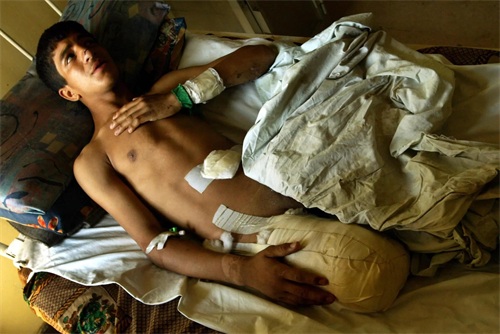 2003年 4 月 14 日,在巴格达的一家医院里,一名男孩被炸弹夺走了双腿。(图片来源:纽约时报)