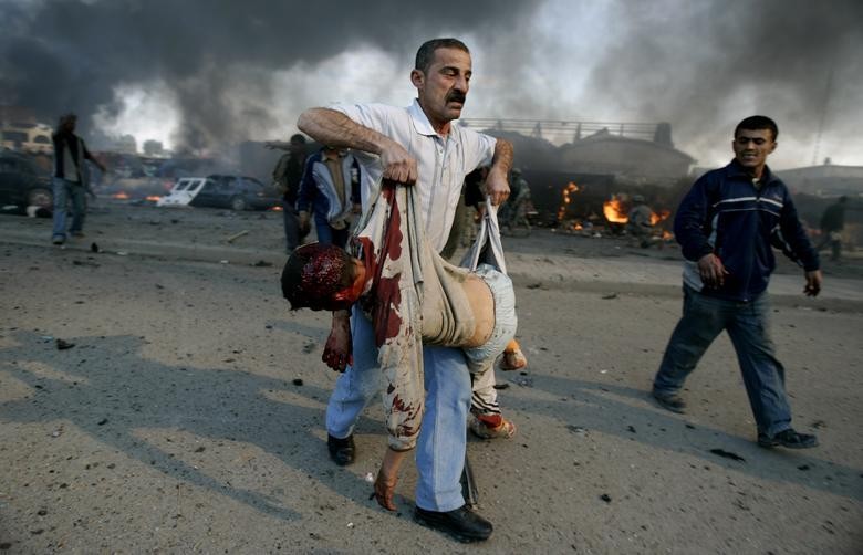 2007 年 2 月 18 日,巴格达东南部一个市场发生汽车炸弹爆炸后,一名男子抱着一名男孩的尸体。(图片来源:路透社)