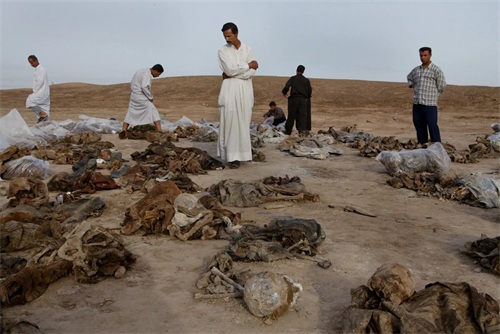 2003年 5 月 14 日,巴格达以南约 60 英里处,一个乱坟岗,村民挖掘出3000 多具遗体。他们是在 1991年被萨达姆处决的什叶派反抗军士兵。(图片来源:纽约时报)