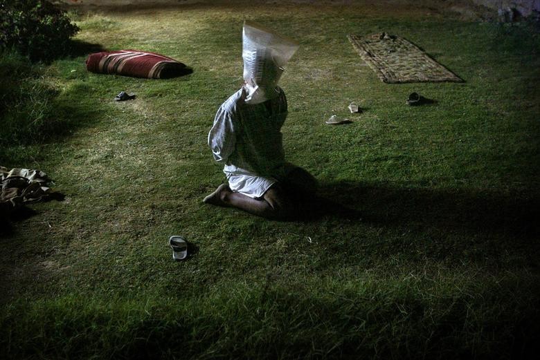 2003 年 10 月 30 日,伊拉克北部城市提克里特,美国士兵在晚上搜查时,逮捕了一名伊拉克男子,并给在他头上套上了塑料袋。(图片来源:路透社)