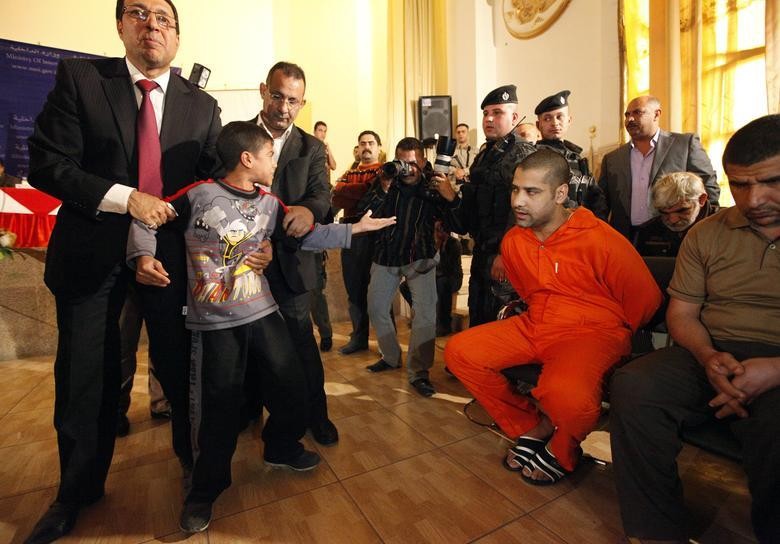 2011 年 11 月 21 日,巴格达内政部,一名男孩痛斥等待审判的武装分子,此前,男孩的父亲已经在 2006-2007 年的宗派冲突中被杀害,他自己也曾被武装分子抓走。(图片来源:路透社)