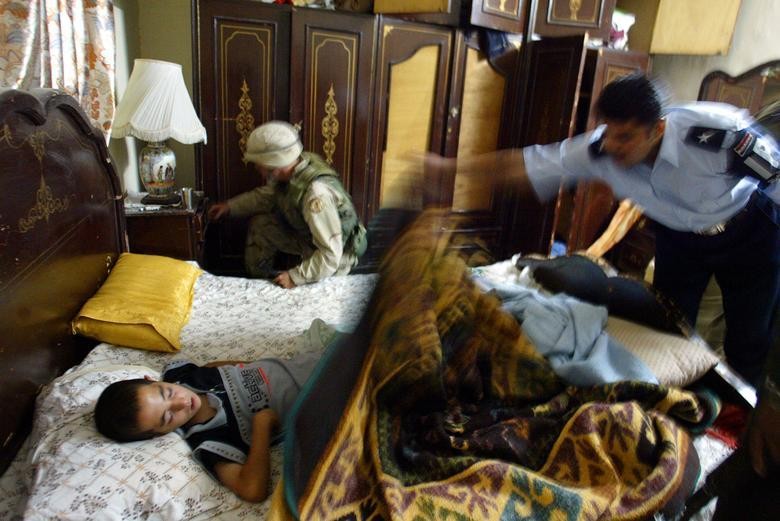 2003 年 9 月 29 日,伊拉克北部城市提克里特,一名儿童在床上熟睡时,一名美国士兵和一名伊拉克警察正在搜查他的家。(图片来源:路透社)