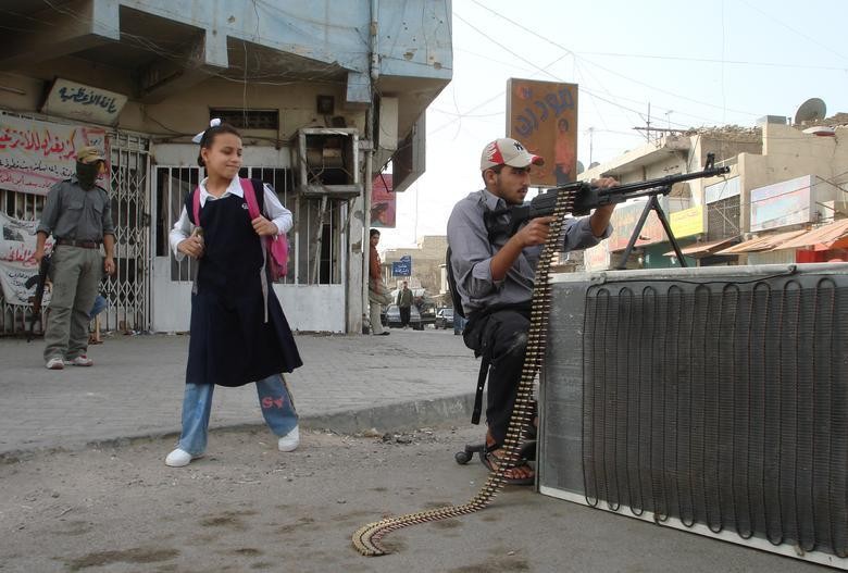 2007 年 11 月 12 日,巴格达 Adhamiya Sunni 街区的一个检查站,居民手持机关枪注视着周围的情况,一名女孩从旁边经过。(图片来源:路透社)