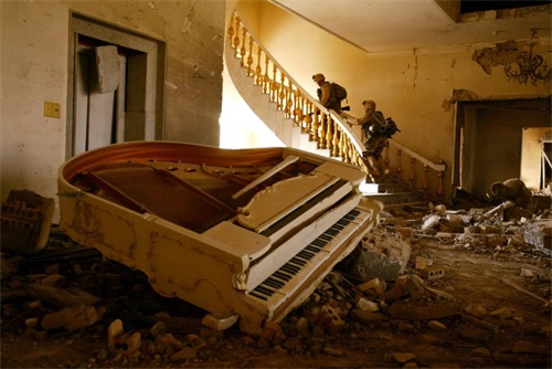 2003年 4 月 10 日,美军士兵搜索萨达姆位于巴格达的宫殿,它已经被炸弹摧毁。(图片来源:纽约时报)