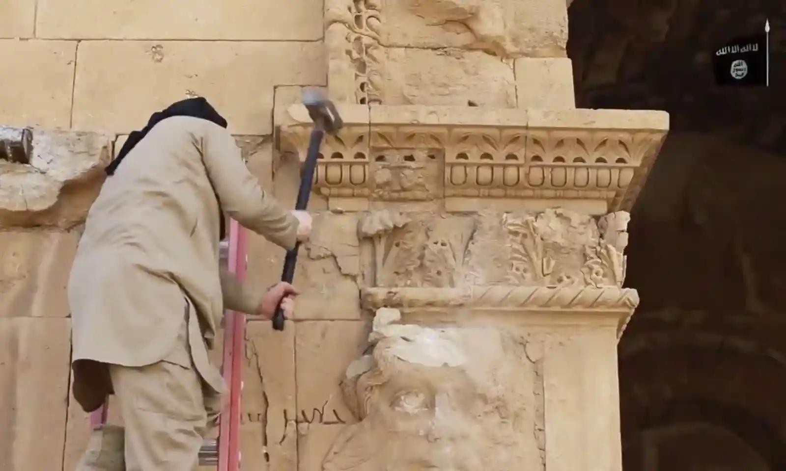 2015 年 4 月,哈特拉,一名武装分子用锤子破坏古城遗址。(图片来源:卫报)