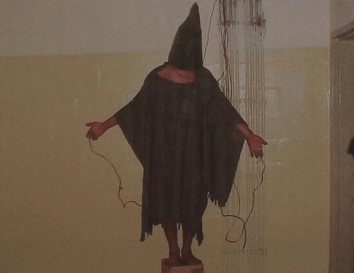 一名伊拉克囚犯在美军控制下的阿布格莱布监狱中被虐待,具体时间不详。(图片来源:纽约时报)