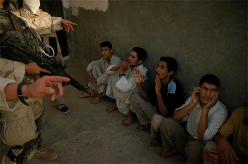 2004年 10 月 10 日,美国士兵和伊拉克国民警卫队成员在这几名男子家中搜查武器。(图片来源:纽约时报)