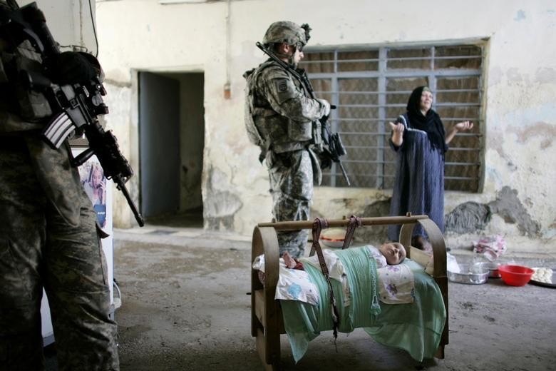 2008 年 6 月 26 日,美军到一名妇女家搜查炸药和反叛分子,旁边一名婴儿躺在摇篮里。(图片来源:路透社)