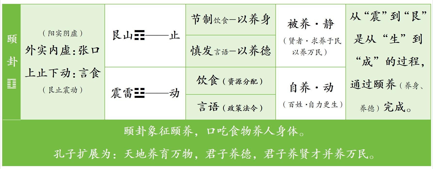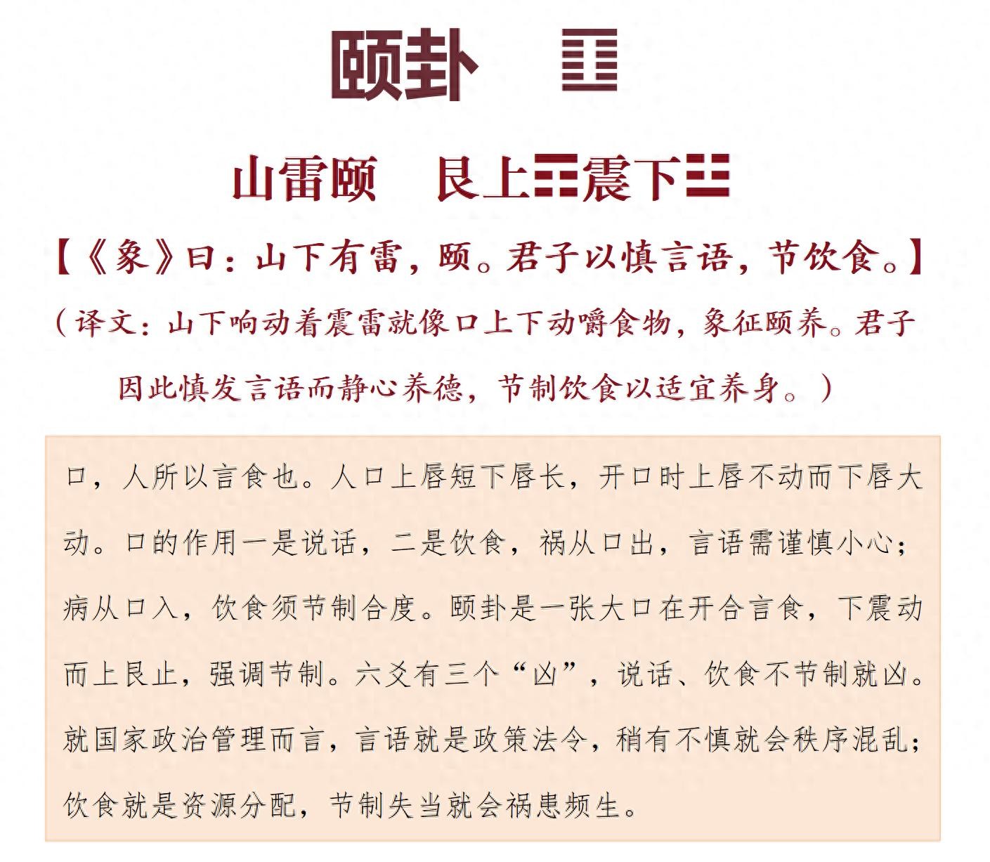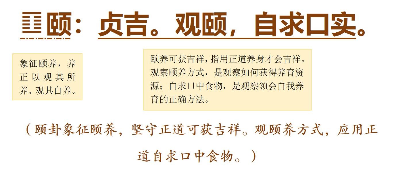颐卦象征颐养,口吃食物养人身体。孔子扩展为:天地养育万物,君子养德,君子养贤才并养万民。“颐”,人脸颊两边红润处,通指脸颊,转指嘴巴、牙床,后加頁作“颐”。人咬嚼食物时,颐会随嘴巴张动,因此“颐”转而表示颐养,“颐,养也”。颐卦卦辞“观颐,自求口实”,观颐,观其所养也。
