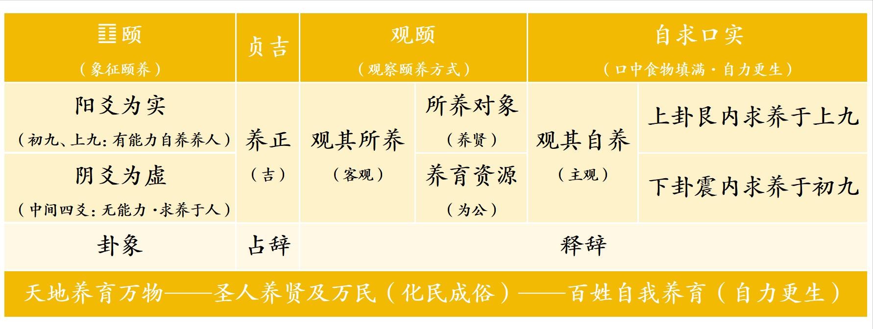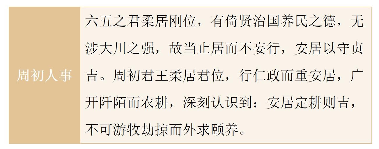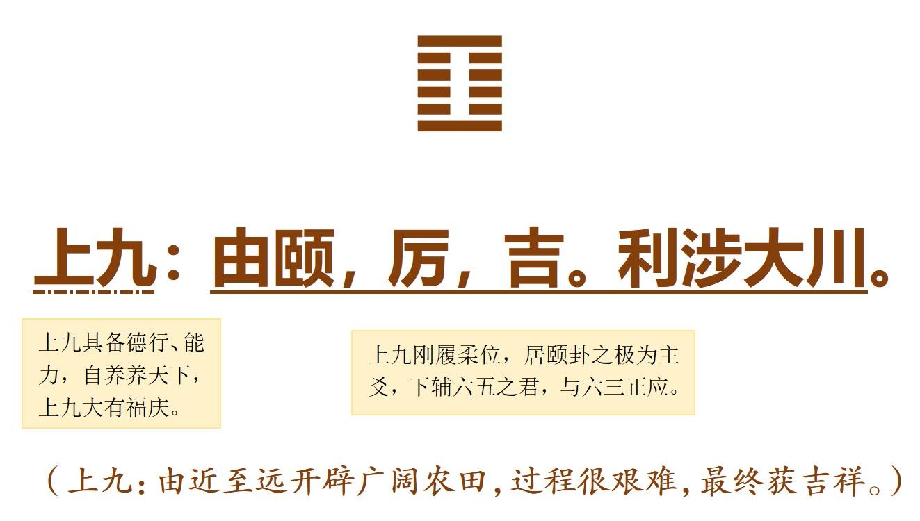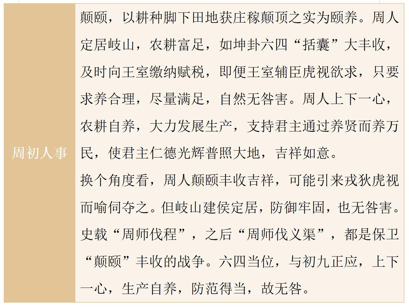 颐卦象征颐养,周初以农立国,作《周易》者以此段史事为依据,述“颐养之道”。颠颐,咎害以农作物成熟下垂之顶实谷物为养,天地顺时养谷物,圣王以德养贤并养万民。周人以农耕颠颐为本,颐卦六爻按占筮实录有序排列,肯定并宣扬这一历史性的抉择,且上升为长治久安的国策。周初农业的井田开辟达到上古史上的最高水平,其后春秋战国发展出牛耕和铁耕,使农业生产方式达到世界先进水平。周初圣贤对定居农业的肯定,眼光远大,智慧高远,成就巨大。自求口实,尚友古人,防范干扰,由本养民,吉祥有庆。