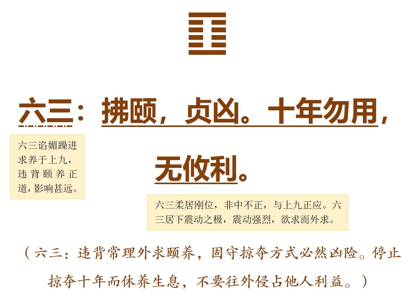 颐卦常理是自求口实,六三应向内求养于初九。但六三不如六二中正,不可求养于初九,只能向上求养于上九,但上九为外艮止之主,不让六三强动上来。如果六三坚持强力往上掠夺,必有贞凶。“十年勿用,无攸利”是诫辞,十为数之终,上九告诫六三终不可用强,不可往外侵占他人利益。六三爻变为賁卦,内虚而多饰,空无所用,自当休养生息。六三的问题出在自身阴柔而不中不正。