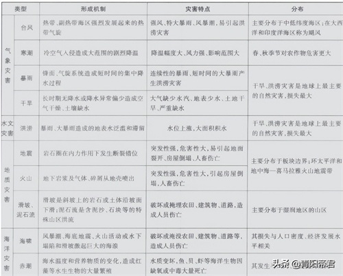 (1)种类多:我国的自然灾害中,最主要的是气象、气候灾害,其次是地质地貌灾害,其中以洪涝、干旱和地震的危害最大。