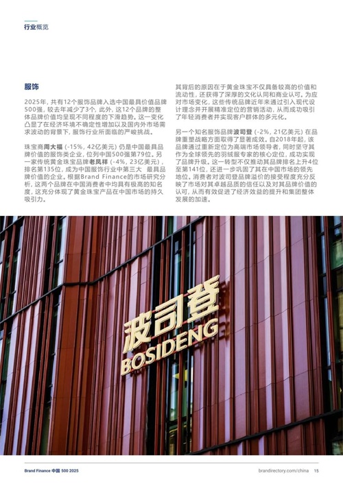服饰:服饰品牌数量较去年减少3个,周大福(-15%至42亿美元)仍居首位,波司登(-2%,21亿美元)在品牌重塑战略方面取得了显著成效。