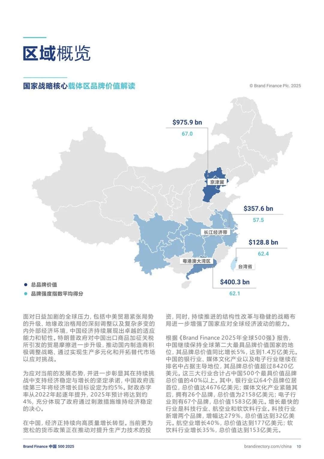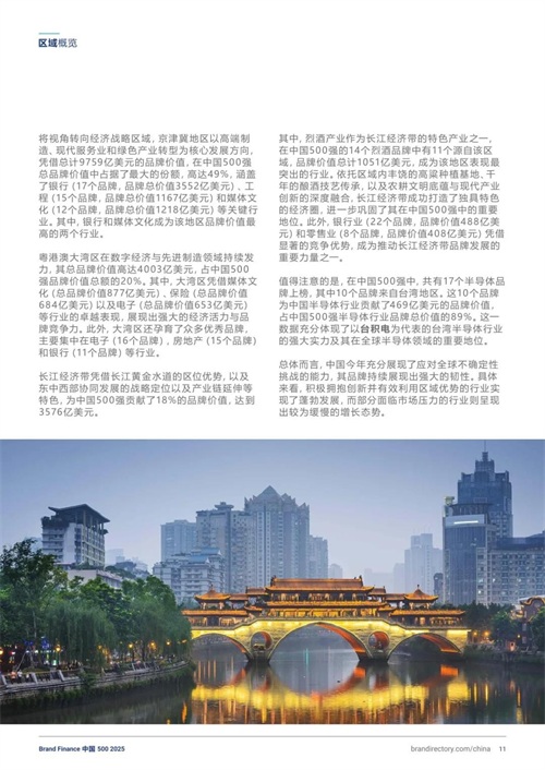 2025年中国500强品牌总价值达2万亿美元,同比增长3%,连续多年稳居全球第二大品牌价值国。抖音以1058亿美元(+26%)蝉联榜首,国家电网(+20%至856亿美元)、中国工商银行(+10%至791亿美元)分列二、三位。区域经济协同效应显著,京津冀、粤港澳大湾区、长江经济带分别贡献总价值的49%、20%与18%,凸显产业集群优势。