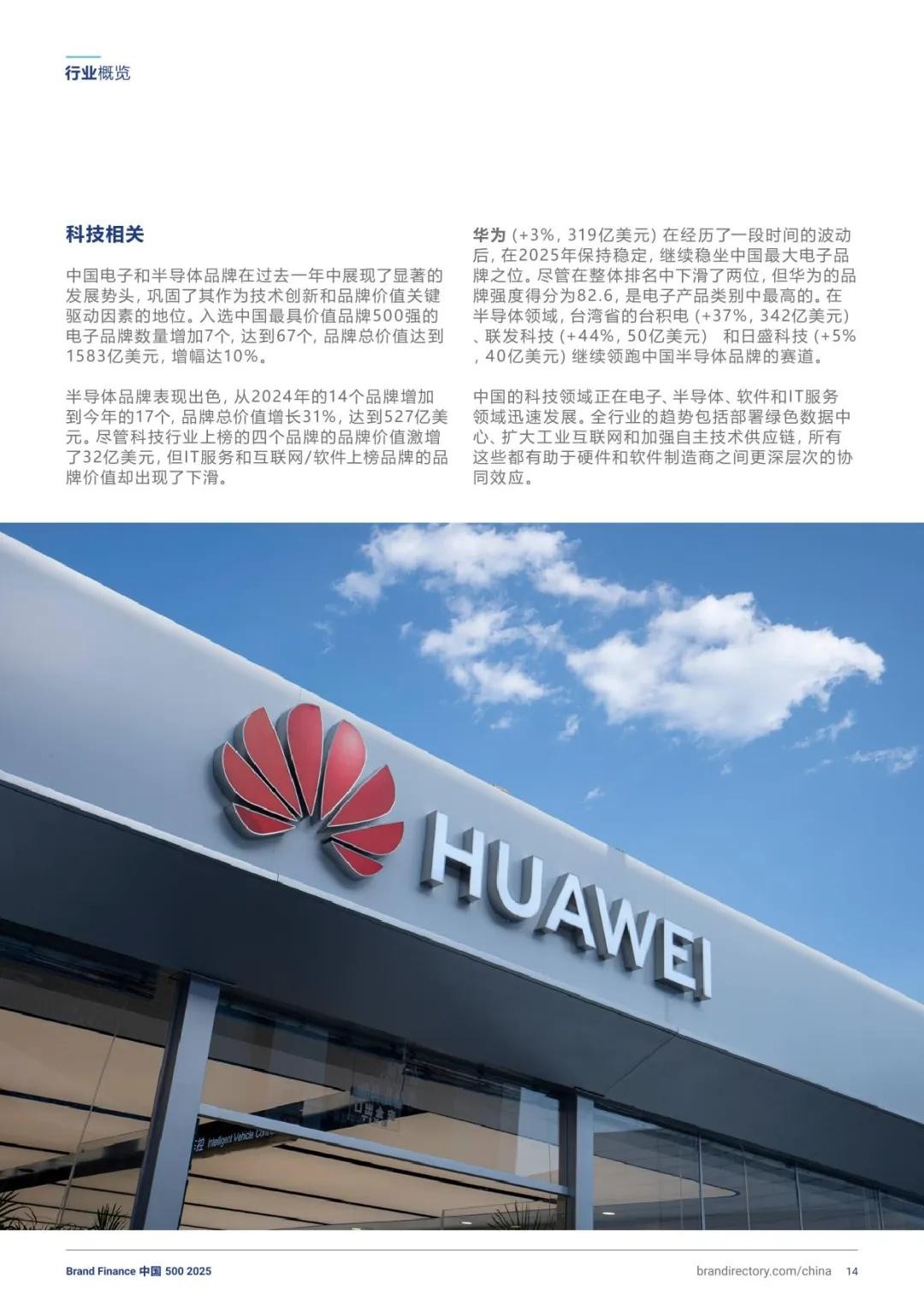 科技与半导体:电子行业品牌价值增长10%至1583亿美元,半导体行业增长31%至527亿美元。台积电(+37%至342亿美元)领跑半导体领域,华为(+3%至319亿美元)保持电子行业首位,品牌强度达82.6。