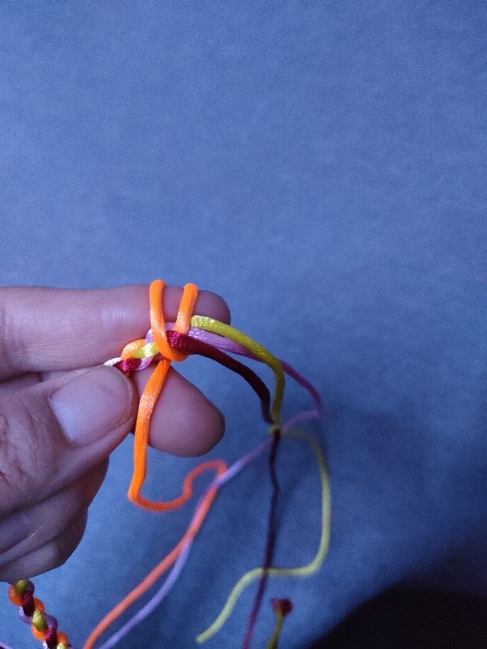 第三步:将红黄两根线自上而下压住粉橙两根线形成交叉,再将粉橙两根线自上而下压住红黄两根线形成交叉,依次类推。