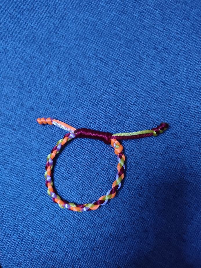 第一步:找四根不同颜色的线,将红黄两根随便打结,粉橙两根线用火机燃烧一点点后立马对齐粘在一起。