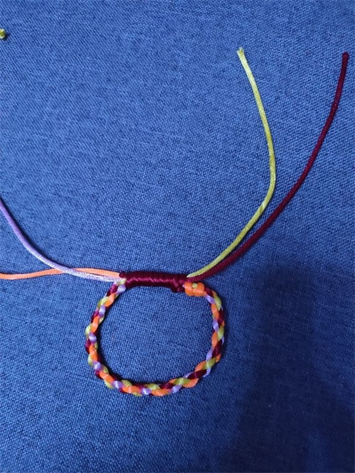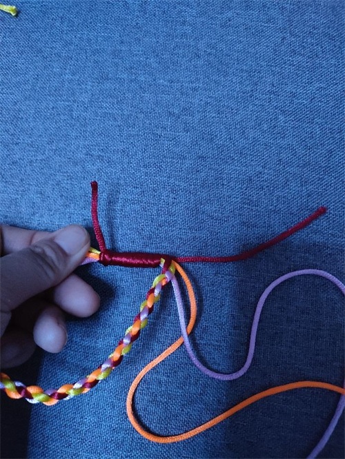 第四步:待编到合适的长度,随便挑一根线打结,如图。