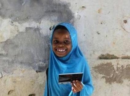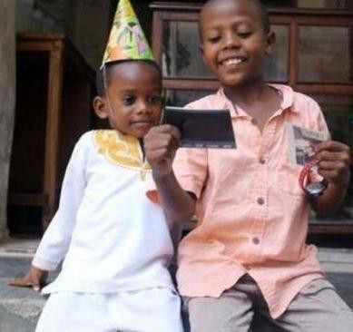 包裹着头巾的小男孩手里拿着自己的照片,笑得十分灿烂,一口洁白的牙齿格外显眼。