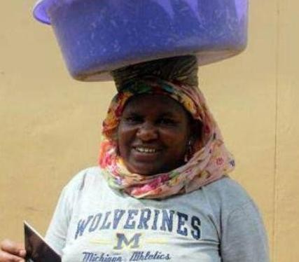 头顶着大盆的妇女手里拿着照片开心的对着镜头微笑。