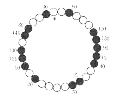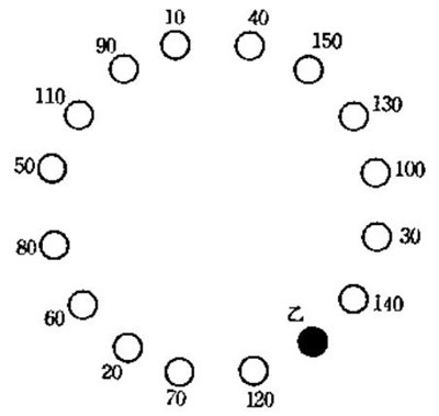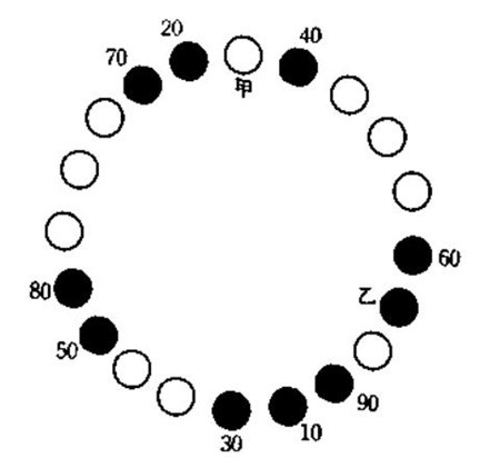 西方的约瑟夫斯问题比较古老,没有具体记载,流传的其实是“土耳其和基督教徒问题”。说的是15个基督徒和15个土耳其人共乘一条船,船突然出了故障,船长宣布必须牺牲15个人,于是按照下图所示的排列方式,从甲开始数,第9个都被扔到海里面,最后,土耳其人全被扔下海了。