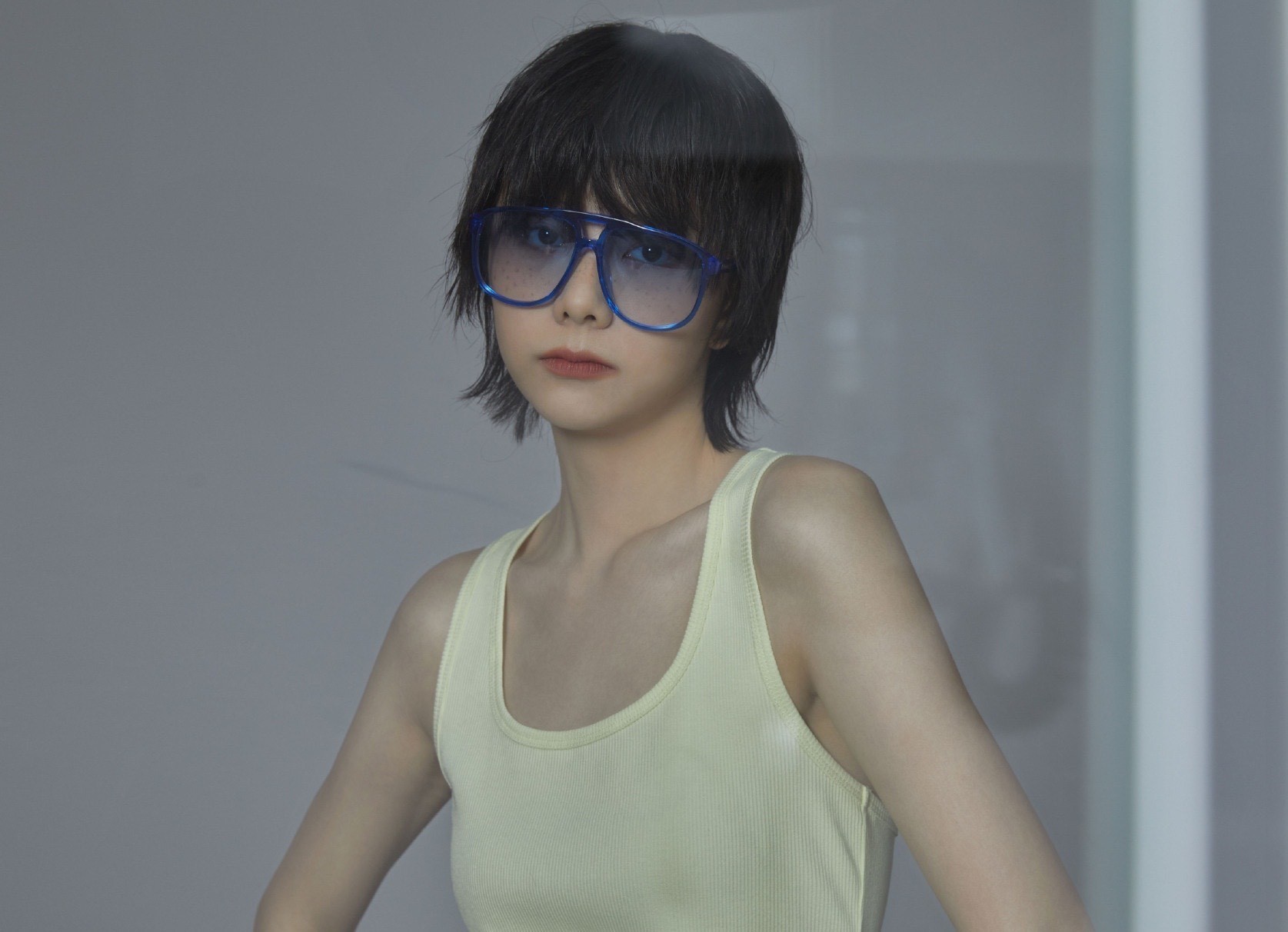 谭松韵在圈内的气质一直都很稚嫩俏皮,因为长着一张娃娃脸所以很难想象谭松韵现在已经29岁了,加上她自身的少女感,饰演高中生的角色完全不在话下。长发的谭松韵已经非常的鬼马俏皮,剪了短发后更显的干脆利落,魅力十足,照片中谭松韵身着嫩黄色背心,瘦下来的谭松韵直角肩越发明显,搭配蓝色科技感十足的墨镜,不得不说谭松韵的时尚表现力意外的很强,整套造型瞬间特别有feel。