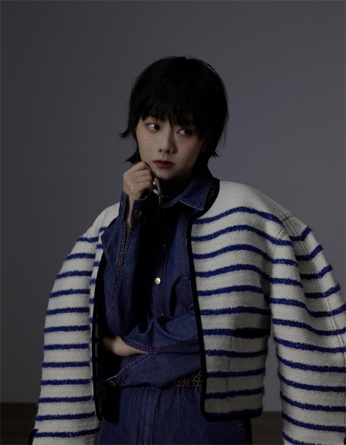 一身深蓝色牛仔衣搭配蓝白条纹针织外套,蓝色系的穿搭很有艺术感,搭配暗色系的背景还有点忧郁的调调,谭松韵俏皮可爱的短发搭配雀斑妆,瞬间精致的像一个洋娃娃一样,珍珠项链也细节感满满,整套造型十分的精致,搭配谭松韵的时尚表现力,还有点复古时尚的感觉。