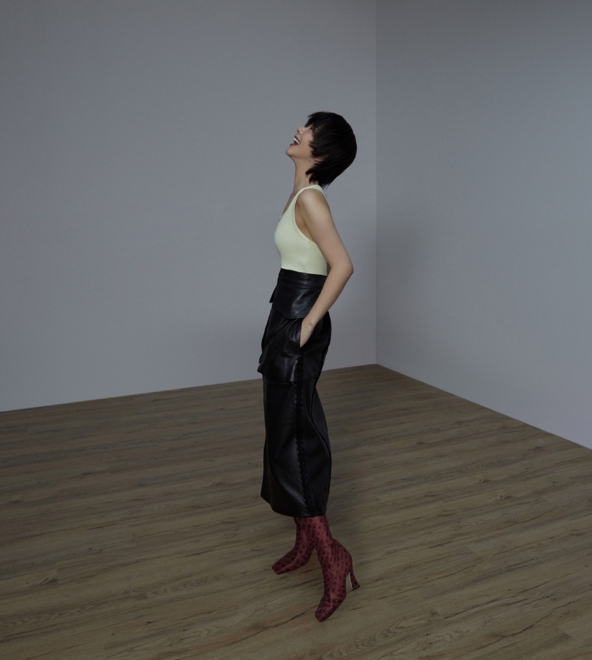 搭配黑色皮质长裙,半身裙的高腰设计很好的提高谭松韵的腰线,而且修饰出谭松韵姣好的身材,皮革的质感搭配红色波点高跟鞋,让谭松韵脱离了稚嫩的感觉,反倒有些成熟大气的韵味,爽朗的笑容让造型更加的豪放随性。