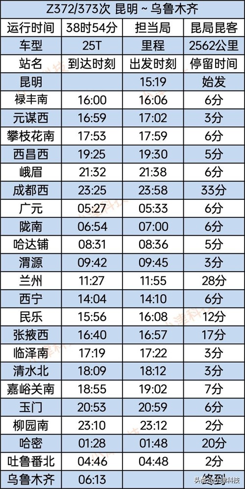 昆明站至乌鲁木齐站Z372/373次运行38小时54分,经停昆明、禄丰南、元谋西、攀枝花南、西昌西、峨眉、成都西、广元、陇南、哈达铺、渭源、兰州、西宁、民乐、张掖西、临泽南、清水北、嘉峪关南、玉门、柳园南、哈密、吐鲁番北、乌鲁木齐。