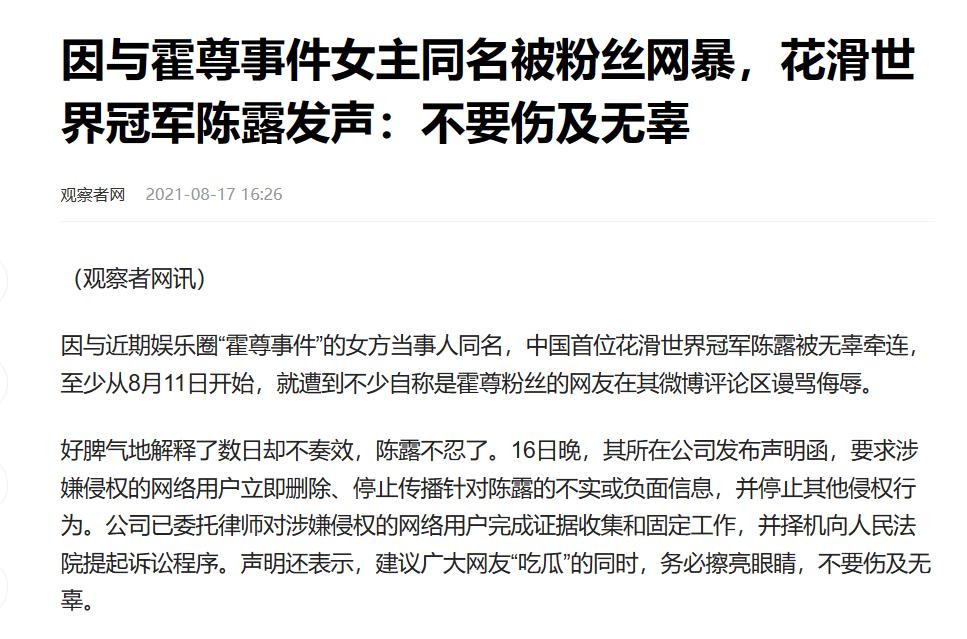 观察者网 2021-08-17 16:26 因与霍尊事件女主同名被粉丝网暴,花滑世界冠军陈露发声:不要伤及无辜