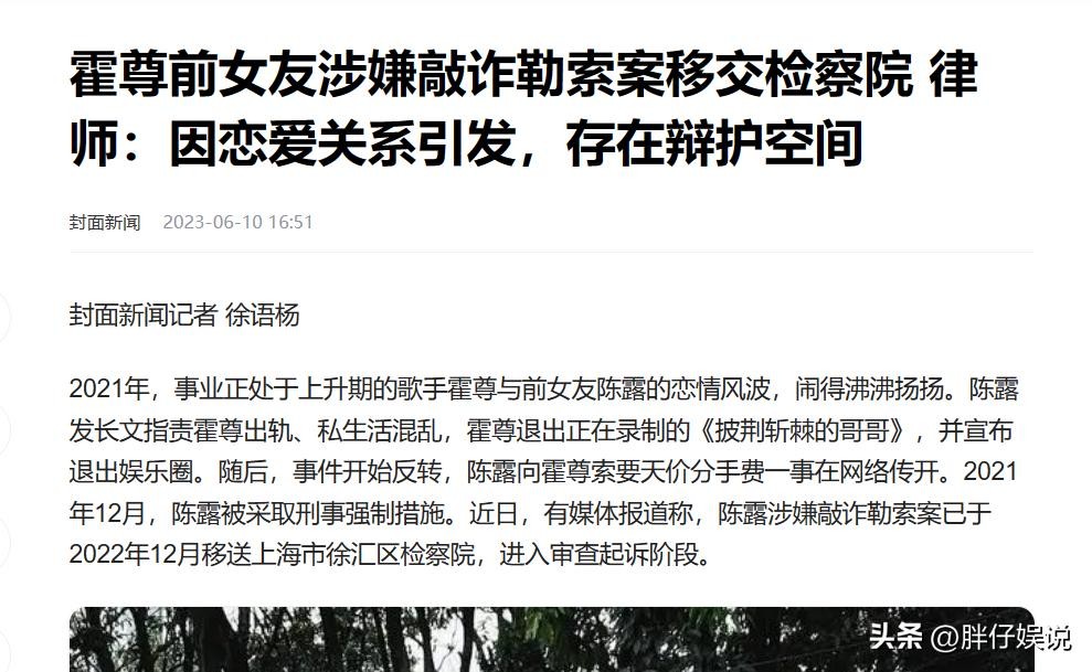封面新闻 2023-06-10 16:51 霍尊前女友涉嫌敲诈勒索案移交检察院 律师:因恋爱关系引发,存在辩护空间