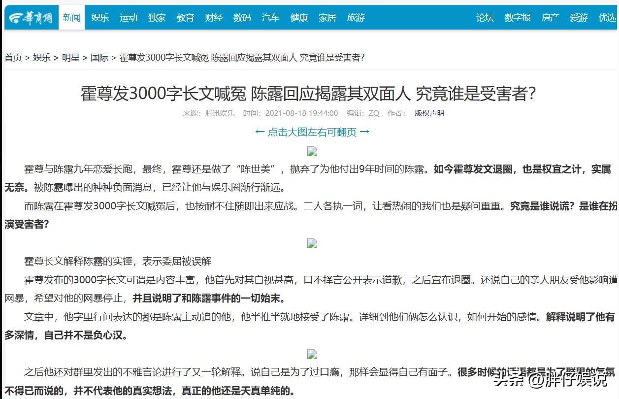 华商网 2021-08-18 19:44 霍尊发3000字长文喊冤 陈露回应揭露其双面人 究竟谁是受害者?